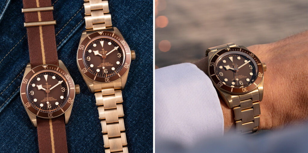 ჩვენი განსაკუთრებული აღფრთოვანება გამოიწვია Black Bay-ს ბრიჯაოს მოდელმა. კორპუსი დამზადებულია გაუპრიალებელი ბრინჯაოსგან, ხოლო ქეისბექი ბრინჯაოსფერი შრით დაფარული ფოლადისგან შედგება. ბრინჯაოსგან არის დამზადებული ცალმხირვად ბრუნვადი ბეზელიც, რომელზეც ალუმინის ფირფიტაზე განლაგებული ინდექსებია წარმოდგენილი. სტანდარტისამებრ, აქაც გვაქვს საფირის შუშა და მანუფაქტურული მექანიზმი MT5601, რომელსაც ქრონომეტრის სერთიფიკატი აქვს მინიჭებული. კორპუსის დიამეტრია 43 მმ. მოდელის ღირებულება 3.870,00 ევროა.